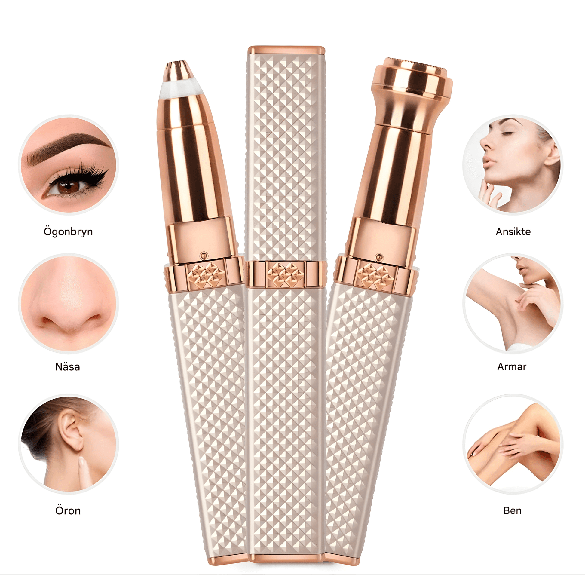 De rundade bladen i rostfritt stål med 18K guldplätering är utformade för att vara skonsamma mot huden samtidigt som de kan bidra till att ta bort oönskat hår med precision. Den lyxiga ytan ger inte bara ett elegant utseende utan kan även minska friktionen mot huden.